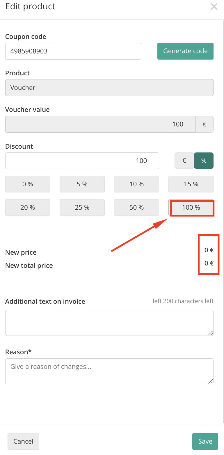 Selling Price: The price at which the voucher is sold (e.g., 0€ for a gift, 25€ for a regular sale).