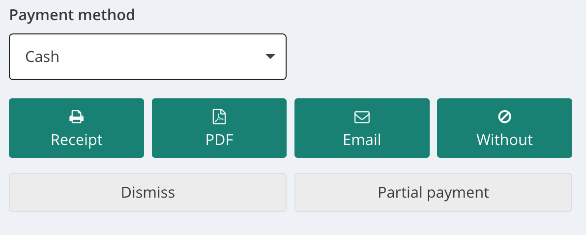 Close the sale: The selling process is the same as for services and items. You need to choose a payment method and complete the sale by clicking "invoice", "pdf", "email" or "without".
