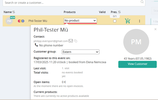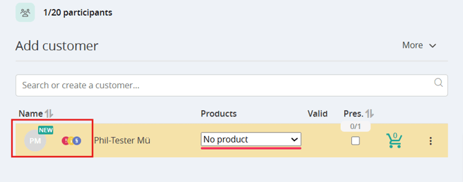 - The green "NEW" sign indicates a new customer. It marks their first participation. Once you mark this participation as "present", the "NEW" sign will no longer appear for future bookings by this customer.