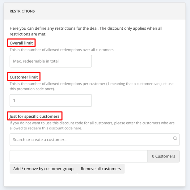 Just for specific customers: Enter the email addresses of customers who are allowed to use the code