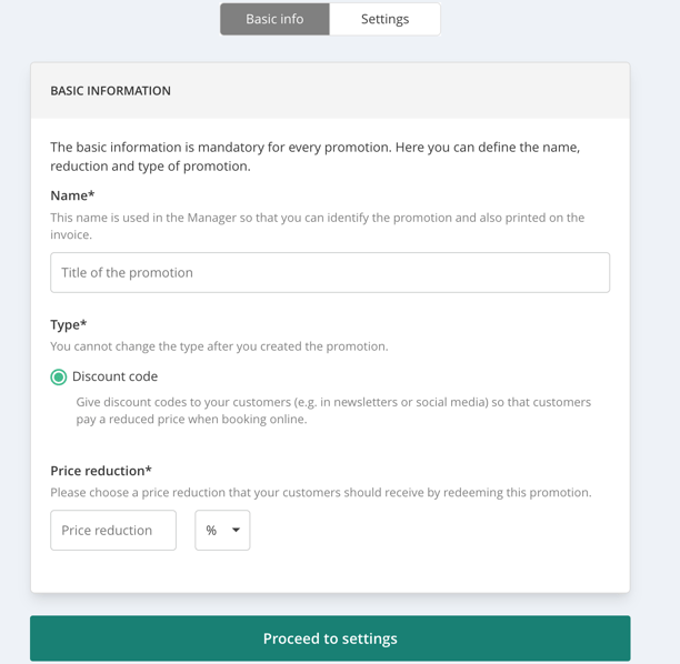 On the first page, you can set up the basic information of the promotion code. These details can be changed later.