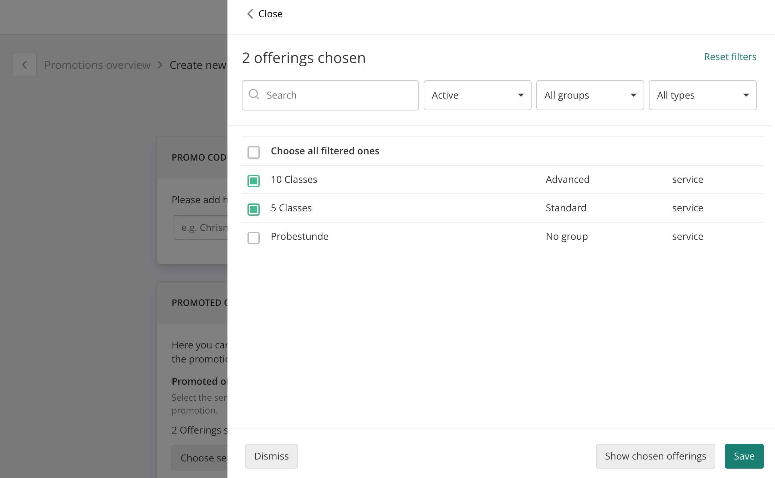 You can create discount codes for specific services (e.g. time-based passes or multi-session passes), tickets, selected video purchases, or even specific venues.