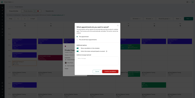 In the appointment details modal, when you click on an appointment in the calendar you can find the cancellation option as one of the top icons. You can cancel an appointment by clicking on it and defining some cancellation options. You can choose to still show the appointment in the calendar or remove it from there. Also, there is an info option to inform the customer and potentially the teacher via email. If you want to add additional info to the cancellation confirmation, you can add it to the message box before confirming the cancellation.