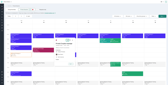 Once you have setup private session offers, you can schedule private session appointments in the private session calendar that you find in your Activities section of the Manager. Let’s have a look at the following tasks: