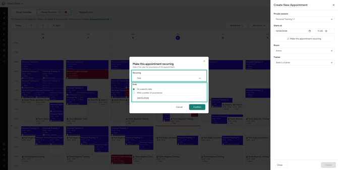 To create a new private session you can either click on the desired spot directly in the calendar or click on the “New” button on the right top and choose “Single or recurring appointments”.
