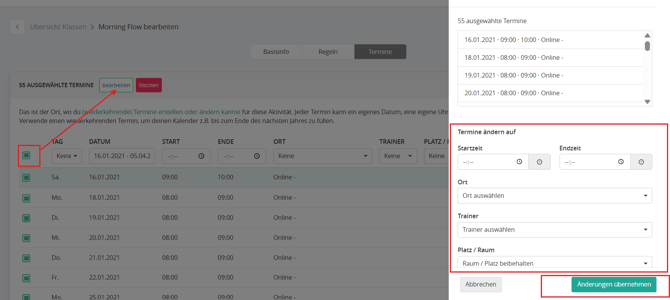 Bearbeiten von einzelnen oder mehreren Terminen einer Klasse/eines Trainings
