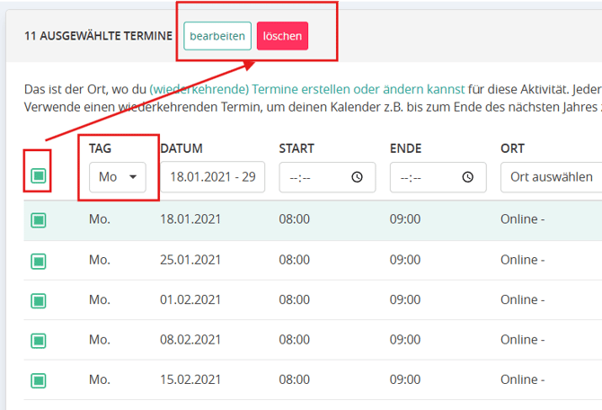 2. Mehrere Termine gesammelt bearbeiten / löschen