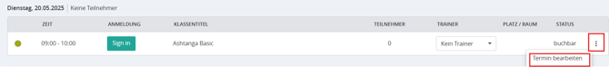 Klicke dazu auf den Menüpunkt Aktivitäten > Klassen (oder Trainings) und navigiere zu dem Termin, den du bearbeiten möchtest. Um das Bearbeitungsfenster zu öffnen, klicke auf die drei Punkte rechts daneben und anschließend auf „Termin bearbeiten“.