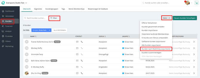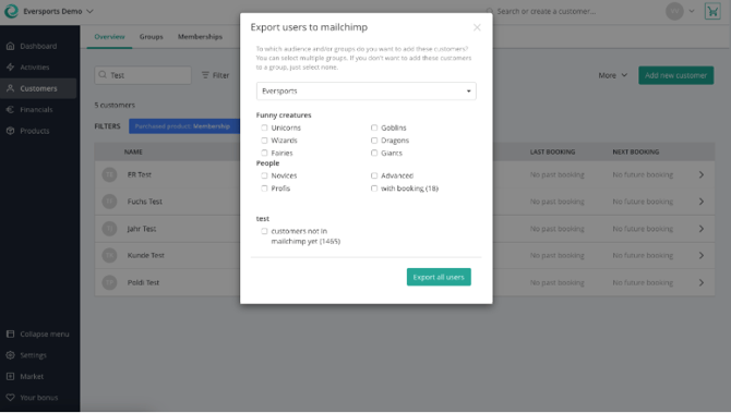 Nach erfolgreicher Verbindung kannst du Kundendaten aus dem Eversports Manager nach Mailchimp exportieren: