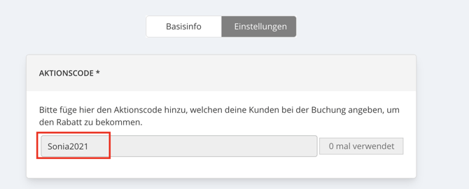 - Aktionscode : Das ist der Code, welche deiner Kund:innen bei der Buchung eingeben müssen. Dieser kann im Nachhinein nicht verändert werden.