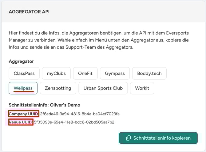 - Kopiere die Company UUID und Venue UUID und teile diese Informationen mit dem EGYM Wellpass® Team