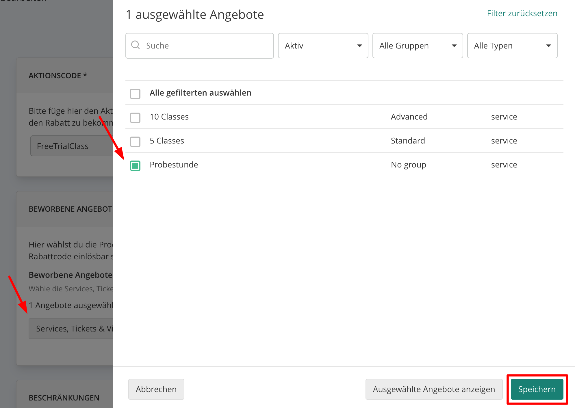 - Wähle den Promocode-Namen (z.B. FreeTrialClass).