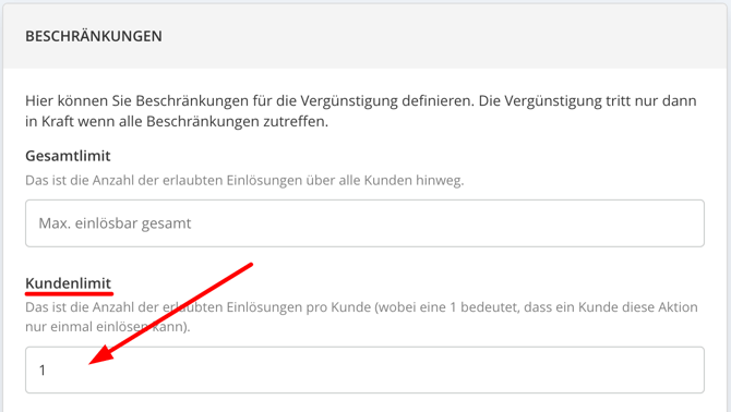 Setze zusätzliche Einschränkungen oder Bedingungen, um die Nutzung der Aktion zu steuern. Für Probestunden empfehlen wir, das Kund:innenlimit auf 1 zu setzen, damit jede Person den Rabatt nur einmal einlösen kann - schließlich sollen neue Kund:innen dein Angebot ausprobieren.