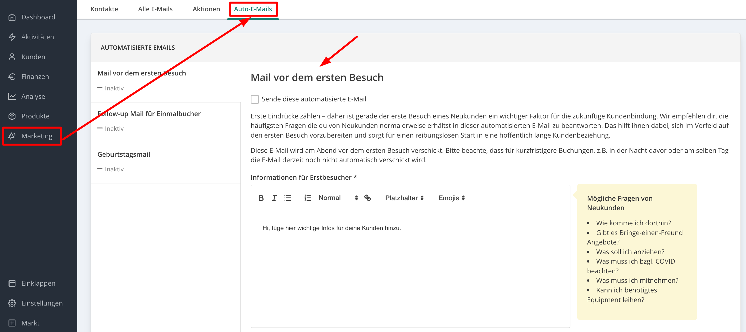 Du kannst die bestehenden automatisierten E-Mails - z.B. im Menü Marketing oder in den Service Einstellungen - nutzen, um dein Empfehlungsprogramm zu bewerben.