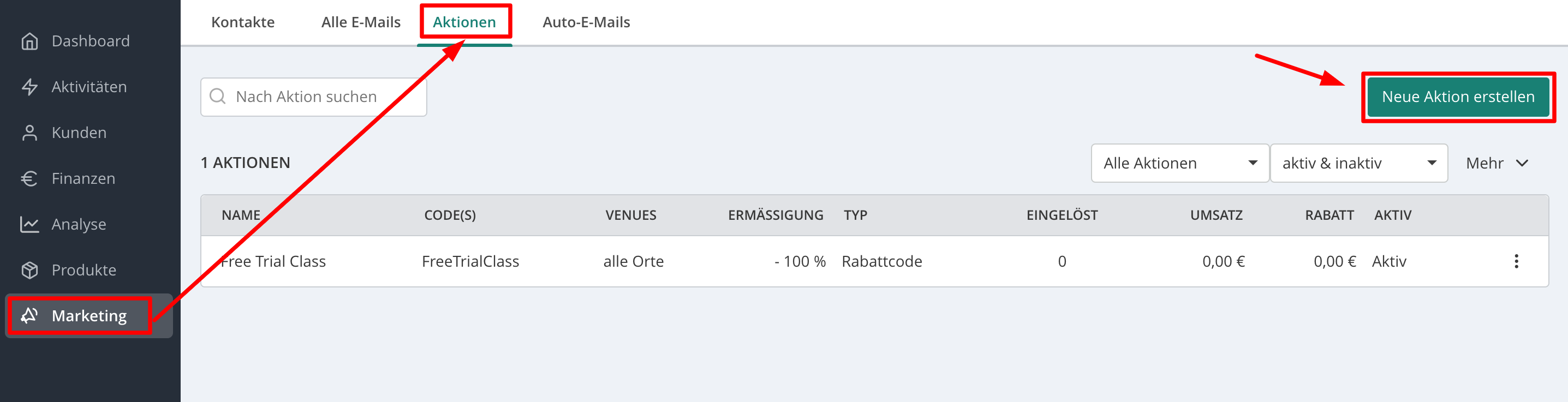 - Gehe zu Marketing > Aktionen in deinem Eversports Manager.