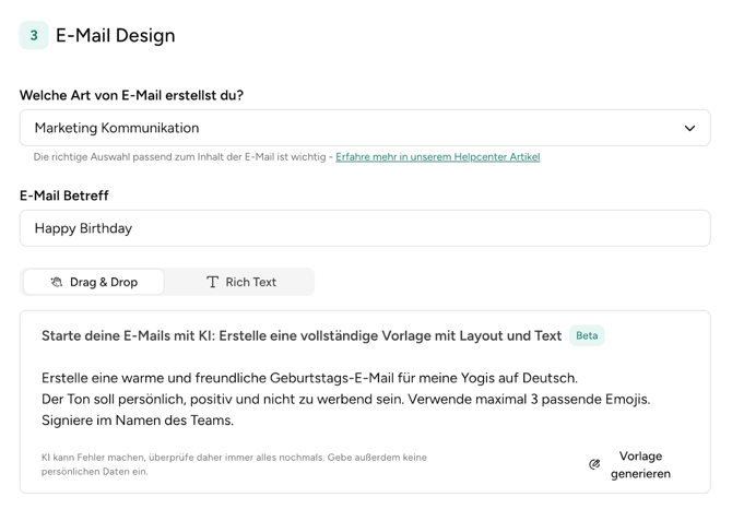 📝 Sei konkret: Je detaillierter deine Beschreibung, desto passender der Entwurf. Statt „Schreibe eine E-Mail" besser: „Schreibe eine motivierende E-Mail für Kund:innen, die 10 Besuche erreicht haben."