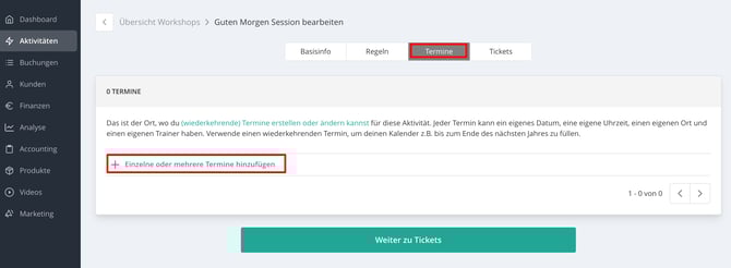 - Klicke auf "+", um einen oder mehrere Termine zu erstellen. Du kannst bei Bedarf auch Tickets verwenden - mehr dazu hier.