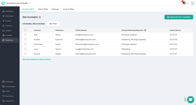 Diese Tabelle listet deine Kontakte aus all deinen Standorten. Zusätzlich siehst du wichtige Informationen, wie z.B. die E-Mail Adresse, welche Kommunikationen deine Kund:innen von dir über den Eversports Manager akzeptieren, und wann ihr letzter Besuch war.