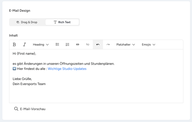 Tipp: Schlichte Text-E-Mails erzielen oft höhere Öffnungsraten, da sie wichtiger wahrgenommen werden. Besonders bei wichtigen Studio-Updates und Informationen ist es von Vorteil, wenn sich deine Leser:innen auf den Inhalt konzentrieren können, ohne durch Bilder oder aufwendiges Design abgelenkt zu werden.