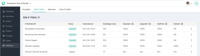 Für jede versendete E-Mail kannst du dir in der E-Mail Übersicht unter Marketing > Alle E-Mails detailliert ansehen, wie sie bei deinen Kund:innen angekommen ist, z.B. durch die Öffnungs- und Klickrate. Die gewonnenen Erkenntnisse helfen dir, aus deinen bisherigen E-Mails zu lernen und deine zukünftige Kommunikation gezielt zu optimieren.