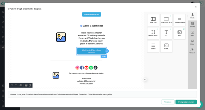 Gestalte E-Mail-Layouts ganz nach deinen Wünschen und passend zu deiner Markenidentität. Füge Bilder, Buttons und Social Links mühelos hinzu.