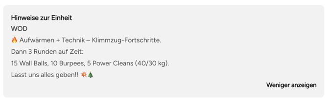 Für CrossFit- oder Fitnesskurse: Liste die geplanten Übungen auf. Das hilft Kund:innen, sich vorzubereiten und passende Kurse zu wählen.