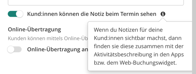 - Du kannst auswählen, ob du die Notizen für deine Kund:innen sichtbar machen möchtest