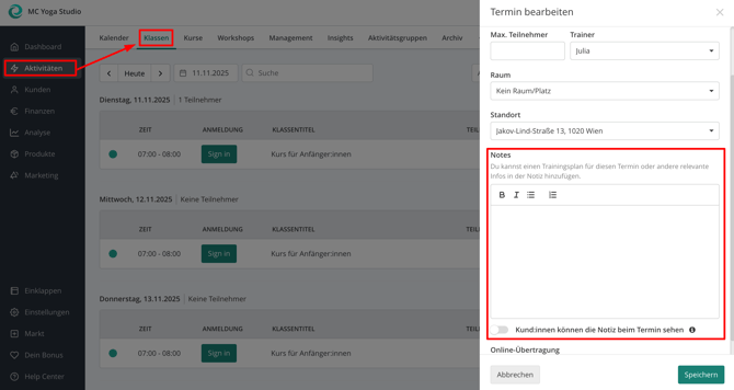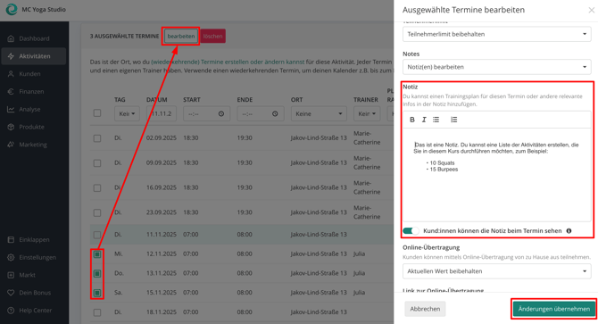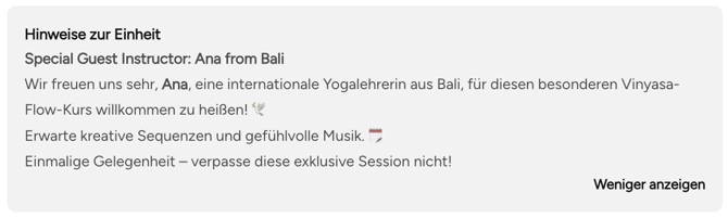 Egal, ob du ein Spezial-Event ankündigst oder einfach das Workout des Tages beschreibst – du kannst die Notizen zu einzelnen oder mehreren Kursterminen individuell anpassen.