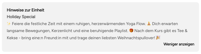 Hebe saisonale Angebote hervor - z.B. Christmas Yoga Flow oder Neujahrs-Detox-Klasse, um mehr Aufmerksamkeit und Buchungen zu erzielen.