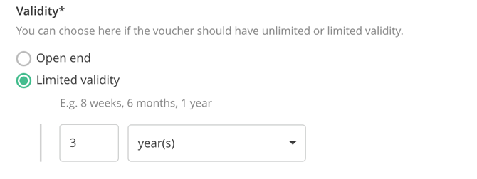 For vouchers a validity of X years (i.e. 3 years) or unlimited can be defined.