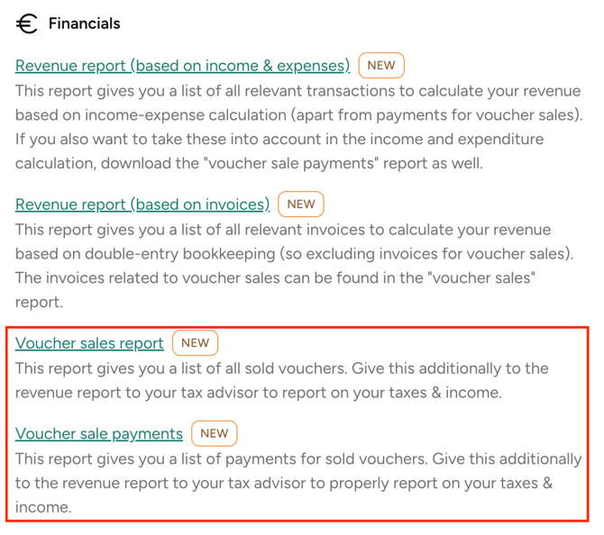 For accounting purposes, important information on voucher sales can be found under (1) Financials > Voucher Journal and (2) Analytics > Reports > Financials.