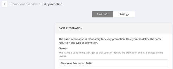 The name chosen for the discount code is for internal purposes only; only the promotional code (e.g. ‘HAPPYNEWYEAR2026’) is visible to customers and will be displayed on the invoice.