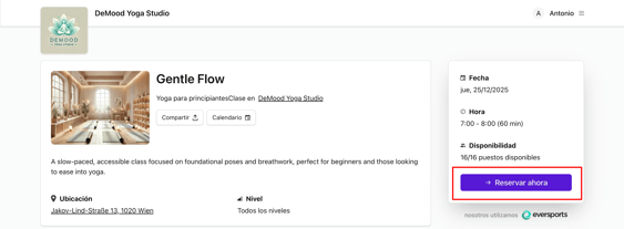 - Las páginas con detalles de las actividades siempre incluirán el nombre y el logotipo del lugar específico para evitar confusiones con la ubicación de la actividad. Por ejemplo, en lugar de mostrar el nombre de la marca «Empire Yoga», mostramos el nombre del lugar «Empire Yoga - Berlín».