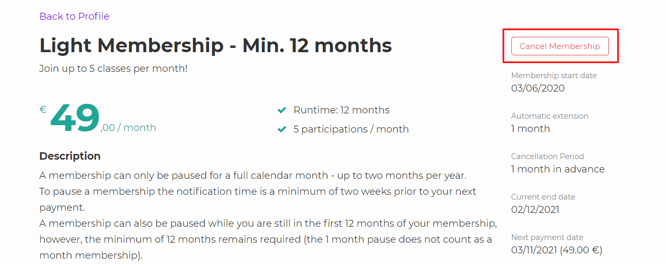 Importante: Si tu membresía fue adquirida directamente en el estudio o centro deportivo (es decir, no a través de Eversports en línea), no puede cancelarse en línea. En ese caso, contacta directamente al estudio por escrito.
