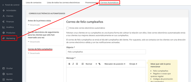 Si aún no ves el menú “Marketing”, puedes activarlo gratis desde el Market.