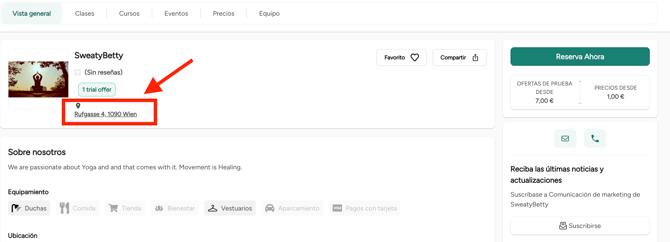 Perfil del estudio: Solo se muestra un perfil y una dirección en la app de Eversports y en el Marketplace.