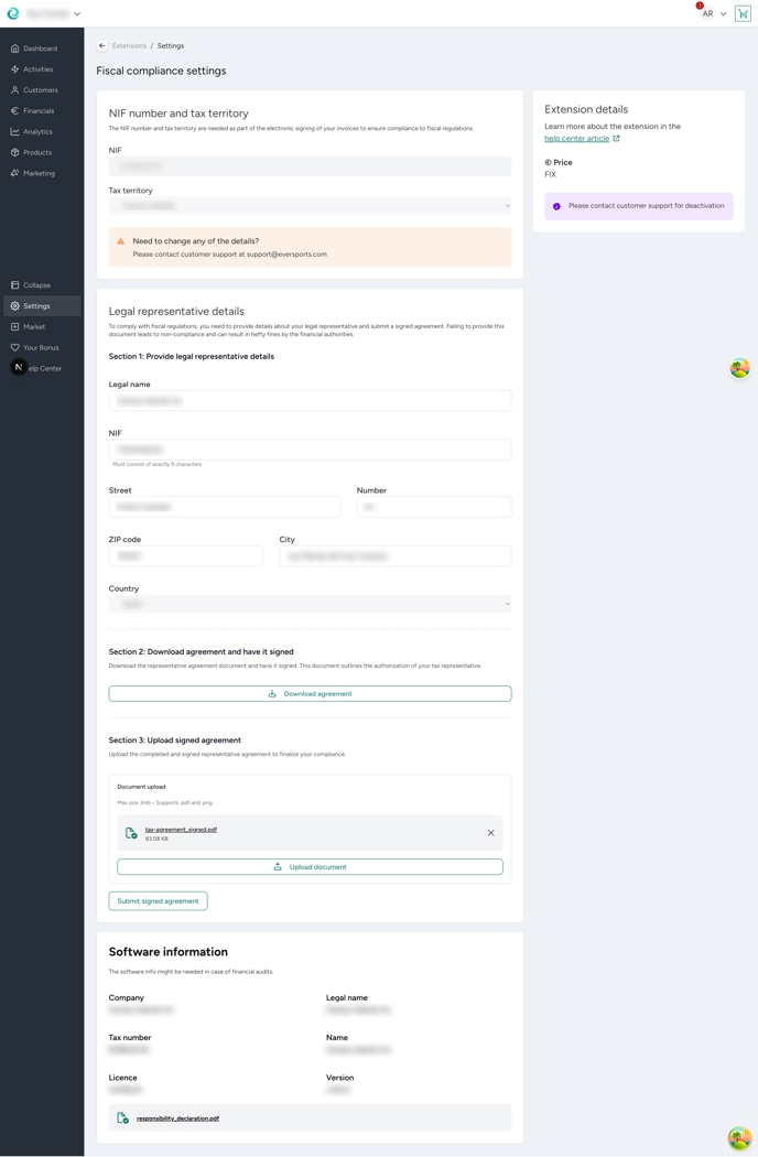 If you are in a "Veri*factu" region, on the other hand, you need to provide some more details from your legal representative, download a document, sign it and upload it again. Only after completing these steps you will be compliant with Spanish fiscal regulations. You can do so via the extension settings when you go to Market, look for the extension and click on the Settings button. Make sure to complete these 3 steps: