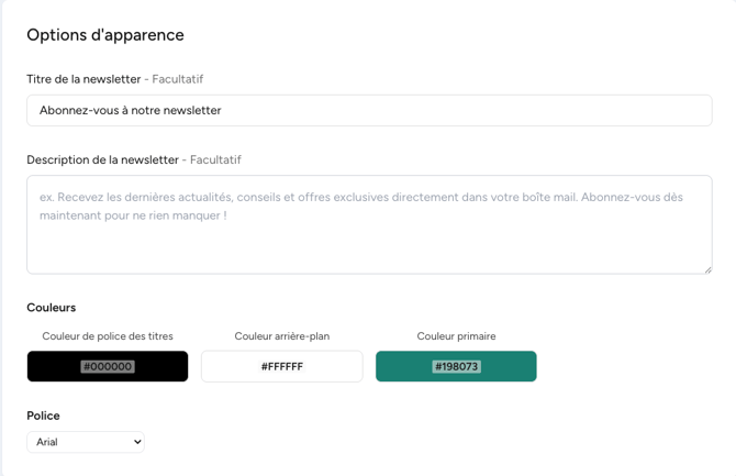 - Description de la newsletter : Ajoutez une courte description facultative pour donner plus d’informations sur vos newsletters marketing (par ex. « Recevez un aperçu mensuel de nos offres à venir. »).