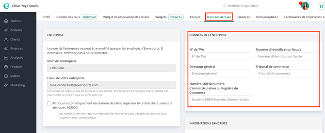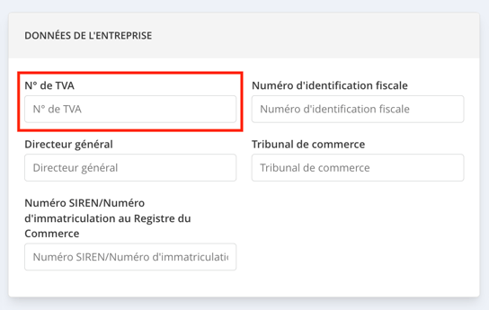 - Dans Données de l’entreprise, saisissez votre numéro de TVA