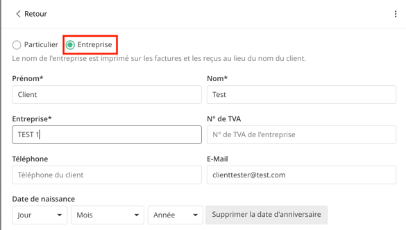 Si un client est configuré comme entreprise avec un nom et un numéro de TVA, la facture sera automatiquement envoyée via PEPPOL, à condition que le client soit également enregistré sur le réseau.