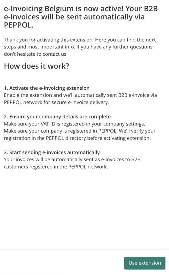 Remarque : Si vous n’êtes pas encore enregistré sur le réseau PEPPOL, vous ne pourrez pas activer l’extension.