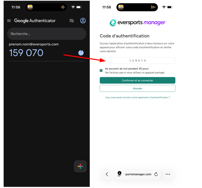 - Dans l’application d’authentification, vous verrez un code à 6 chiffres pour votre compte Eversports.