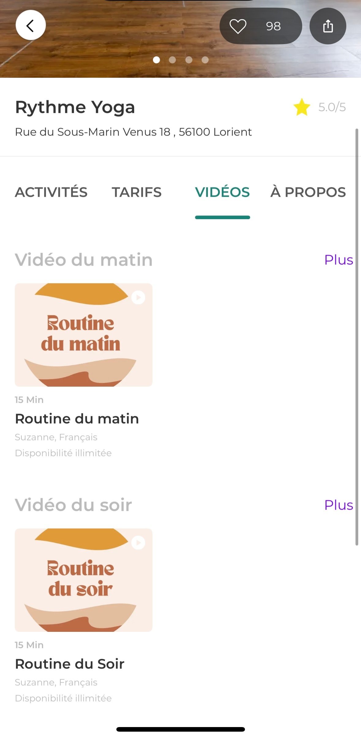 via l’application Eversports : recherchez le nom du studio et ouvrez l’onglet Vidéos