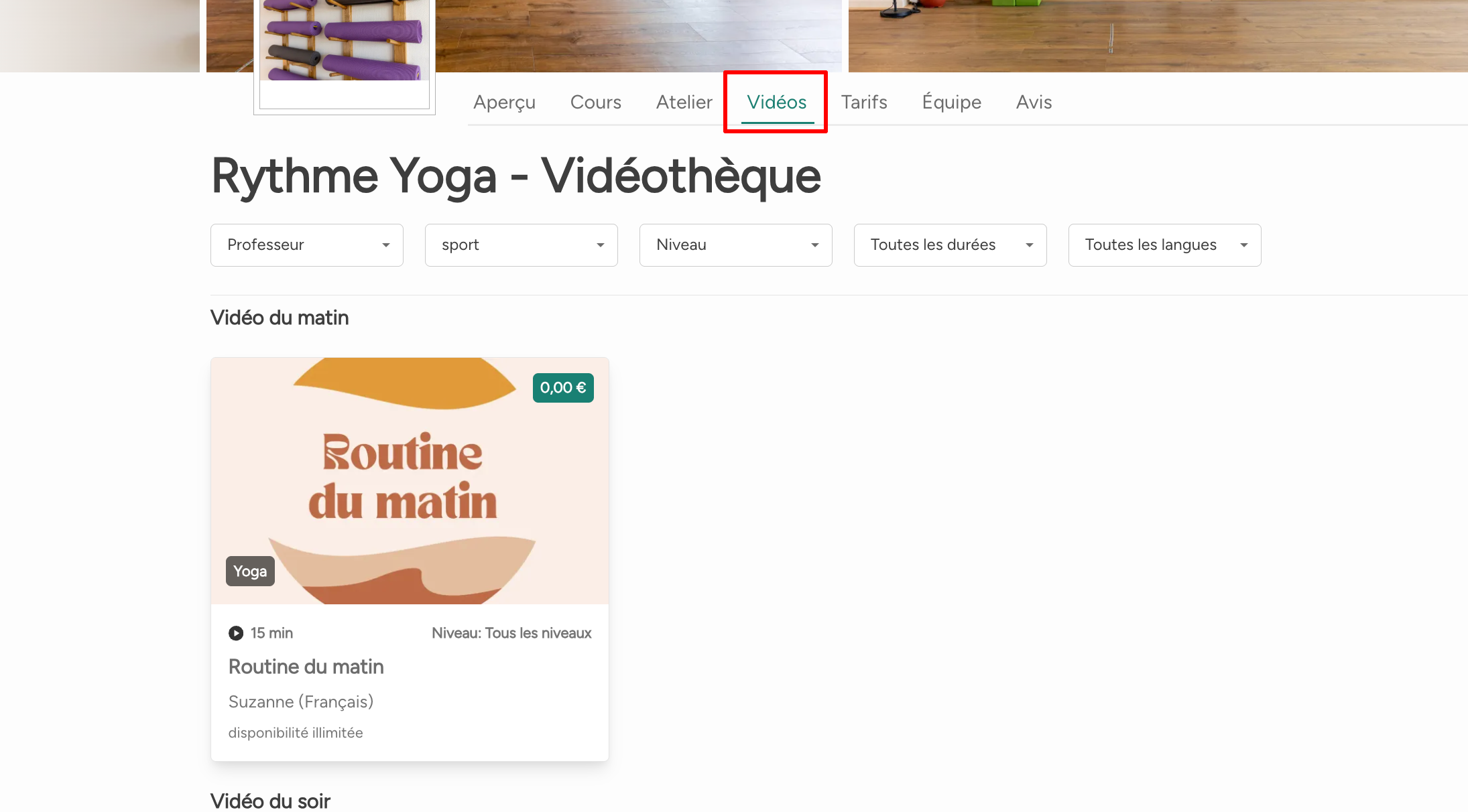via le site web eversports.fr : recherchez le nom du studio et ouvrez l’onglet Vidéos