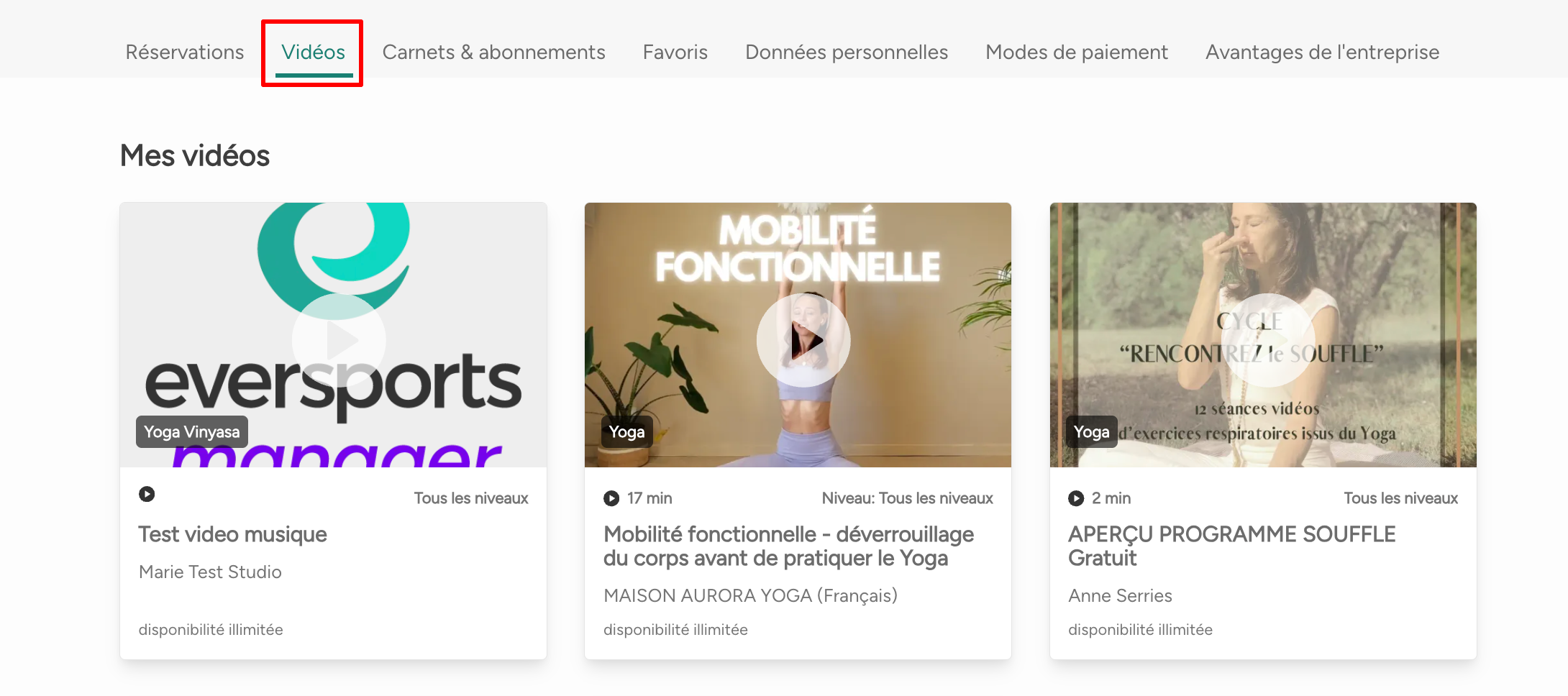 Les studios ont la possibilité de créer des vidéos et de les proposer dans leur vidéothèque. Vous pouvez trouver aussi bien des replays de cours passés que des vidéos à la demande.