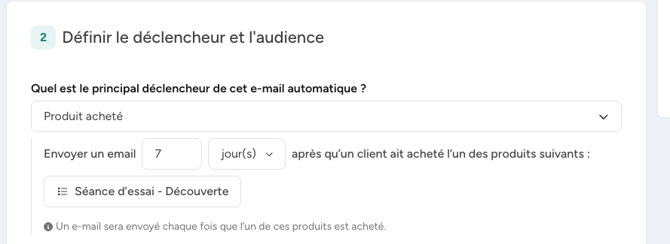 💡 Astuce : En combinant plusieurs emails (par ex. “1 jour après l’achat”, “7 jours après”, “14 jours après”), vous pouvez créer de véritables séquences de communication, aussi appelées parcours client.