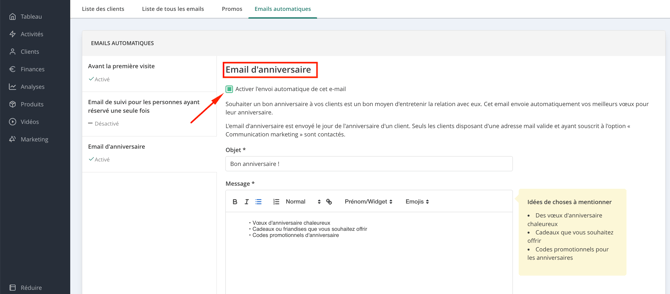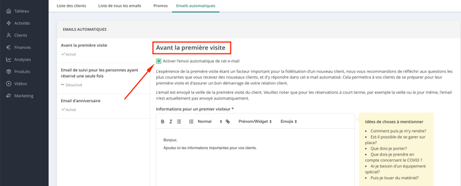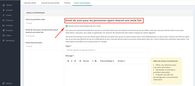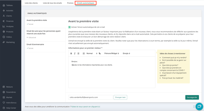 Si vous proposez des cours d’essai, pensez à activer l’email de suivi afin de rester en contact avec vos nouveaux·elles client·es.