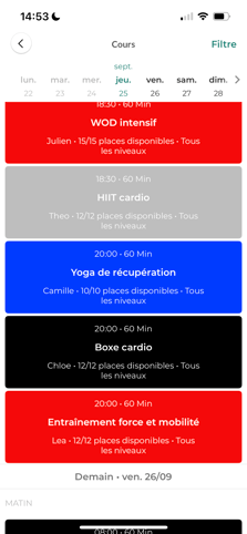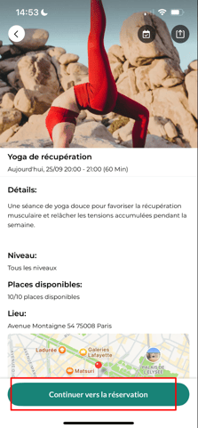 Astuce : si un cours est déjà complet, vous pouvez vous inscrire sur la liste d’attente. Dès qu’une place se libère, vous serez notifié·e et pourrez réserver l’activité. Les notifications doivent être activées sur votre téléphone (dans les paramètres).
