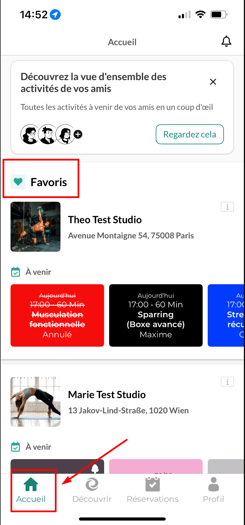 Lorsque vous vous connectez à l’application, votre page d’accueil affiche tous les studios que vous avez enregistrés en favoris (en cliquant sur le symbole du cœur ou en acceptant l’email d’invitation d’un studio). Vous pouvez ajouter ou supprimer des studios favoris à tout moment, simplement en cliquant sur le symbole du cœur à côté du nom du studio.