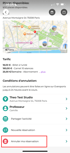 Si vous ne pouvez pas participer à un cours, vous pouvez rapidement l’annuler dans l’application.